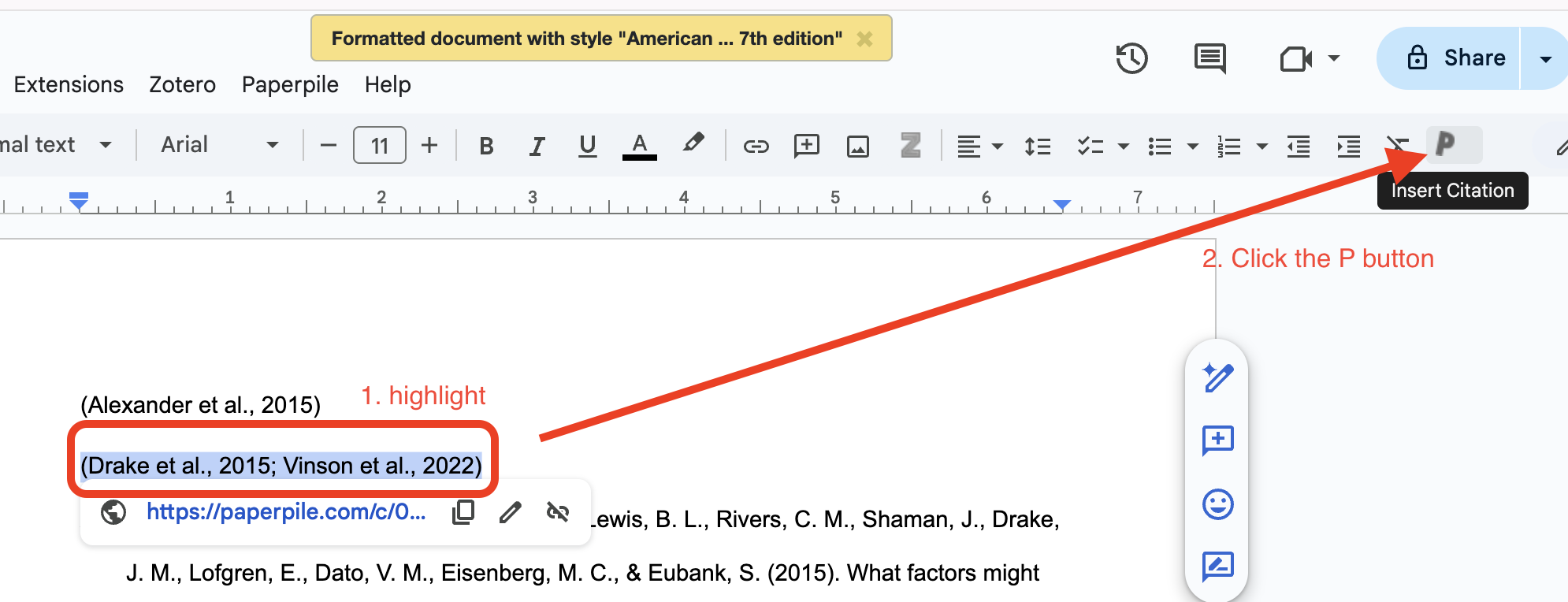 I just wanted to add to the conversation that my Google Docs Paperpile account is also not working correctly. When I update the citation style, it shows the message “Citation style set to APA 7th edition,” but the in-text citations are not updated throughout the document.