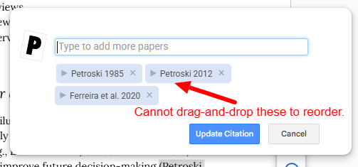 Hello! I’ve noticed that I’m no longer able to drag-and-drop reorder citations in Google Docs. When I insert a citation or update one, everything works as normal except that I am unable to drag and drop the chips to reorder them as I have in the past. I’m only able to reorder them by deleting them all and then entering them in the order I want them to appear—which is a bit laborious. Is this a change or a bug? Any assistance is welcomed. (I’ve already tried turning the plugin off and on again and uninstalling and reinstalling it.)