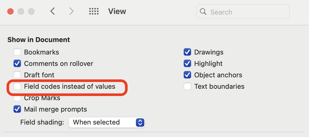 To check this, go to the Word menu and click Preferences > View and uncheck the option Field codes instead of values (macOS)