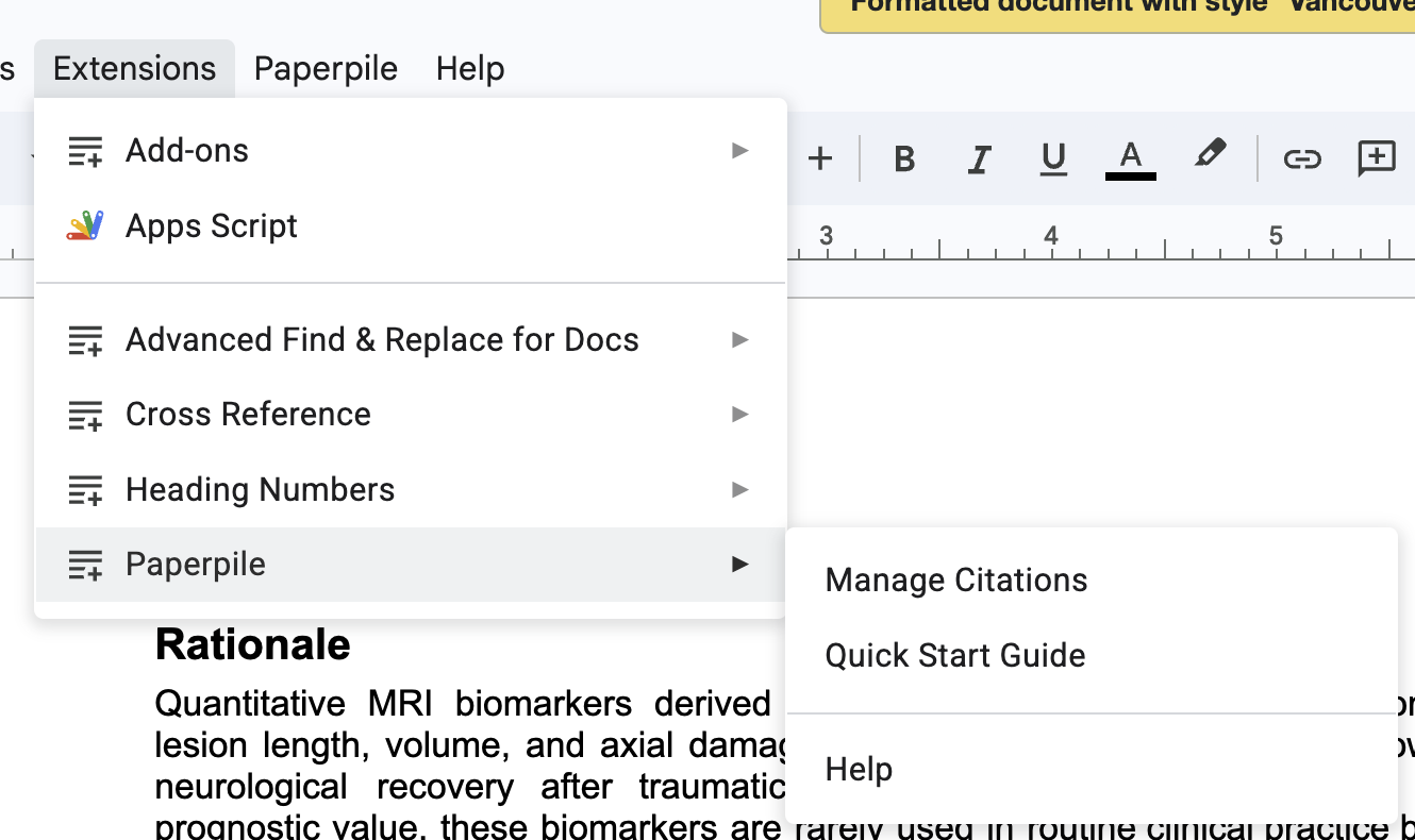 Hello, Google Docs recently added Tabs to organise the documents. Paperpile is having trouble formatting citations with this feature. I tried to recreate the issue, it seems (from my test) that Paperpile will only recognise the first tab and will format it okay, but later tabs won’t format. See here for example - Tab 1 formatted the citations, Tab 2 didn’t