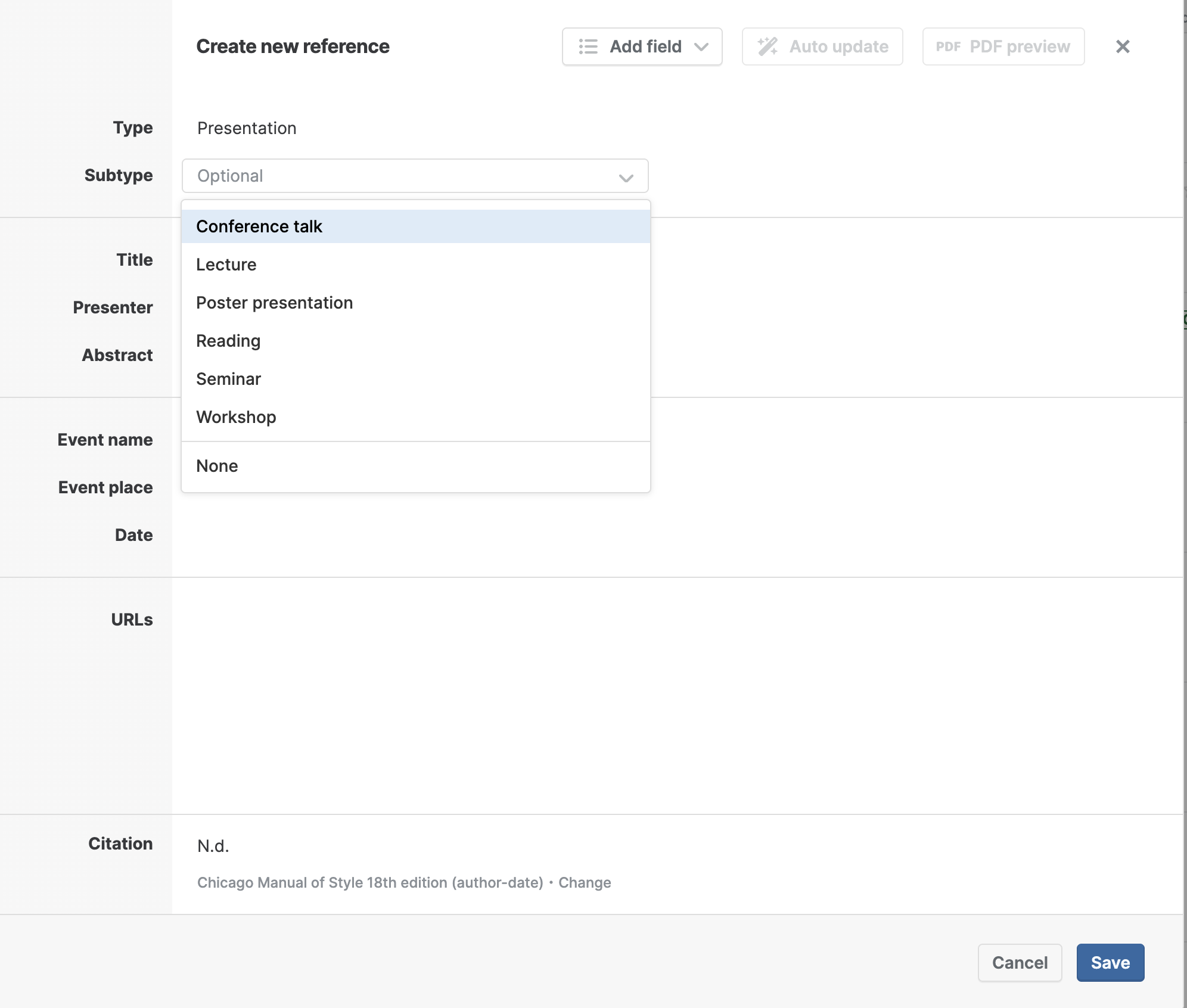 Welcome to our forum, @Kelley_Mahar! Yes, it’s possible to store and organize presentations in Paperpile–there is the Presentation reference type for that purpose: